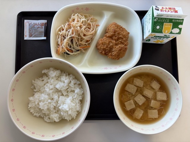 10月3日の給食 公開日 2025/10/06 更新日 2025/10/06 給食 今日の献立は、ごはん、みそ汁(高野豆腐、卵、長ねぎ)、中札内田舎どりのチキンカツ、和風ビーフンサラダ、牛乳です。 給食