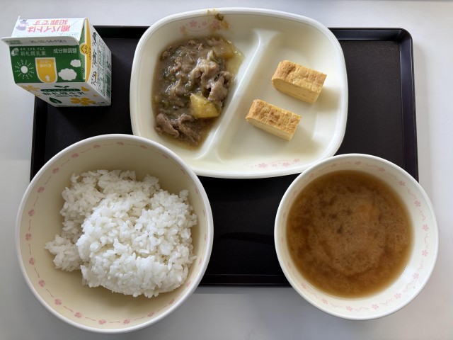 10月8日の給食 公開日 2025/10/09 更新日 2025/10/09 給食 今日の献立は、ごはん、みそ汁(厚揚げ、ごぼう、人参)、豚肉とさつま芋のバターしょうゆ炒め、黄金育ちのクルリン卵焼き(2ケ)、牛乳です。 給食