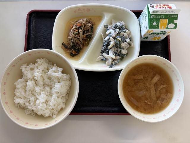 今日の献立は、ごはん、みそ汁(玉ねぎ、油揚げ)、ビビンバ丼の具、ちくわとわかめのマヨおかか和え、牛乳です。