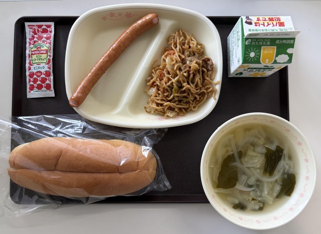 10月16日の給食 公開日 2025/10/20 更新日 2025/10/20 給食 今日の献立は、背割りコッペパン、野菜たっぷりスープ、ソース焼きそば、あらびきソーセージ、Pケチャップ、牛乳です。 給食