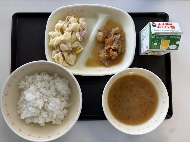 今日の献立は、ごはん、みそ汁(高野豆腐、ふのり)、鶏肉と大根のオイスター煮込み、マカロニサラダ、牛乳です。