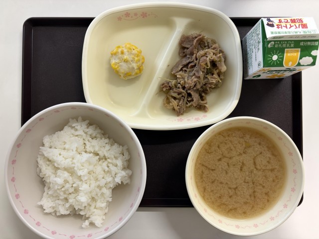 今日の献立は、ごはん、みそ汁(大根、ごぼう、長ねぎ)、どさんコーン、豚ジスカン、牛乳です。