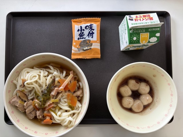 今日の献立は、かしわうどん、白玉入りおしるこ、Pミニ味付小魚、牛乳です。