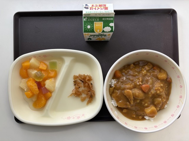 今日の献立は、ごはん、チキンカレー、フルーツポンチ(カクテルゼリー入り)、福神漬け、牛乳です。