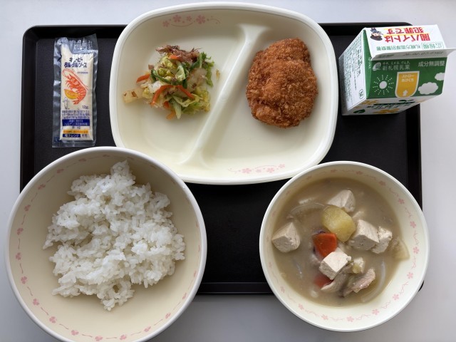 今日の献立は、ごはん、さつま汁、中札内チキンカツ、Pタルタルソース、おかか和え、牛乳です。