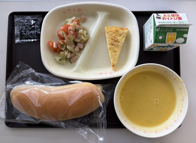 2月19日の給食 公開日 2026/02/24 更新日 2026/02/24 給食 今日の献立は、コッペパン、かぼちゃのポタージュ、スペイン風オムレツ、野菜とお魚のソーセージのソテー、Pチョコクリーム、牛乳です。 給食