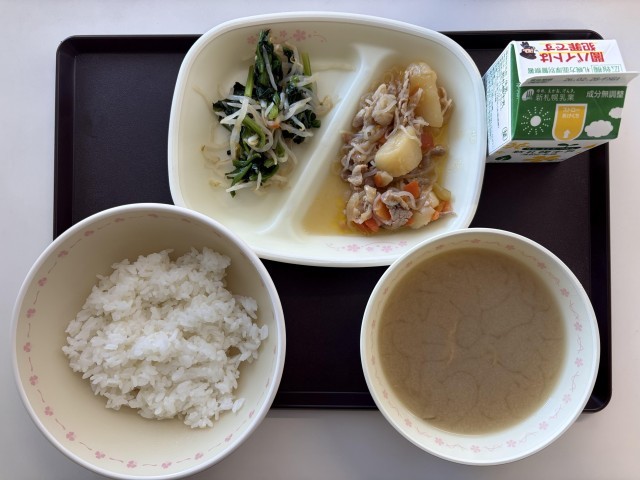 今日の献立は、ごはん、みそ汁(油揚げ、ごぼう、大根)、肉じゃが、もやしとほうれん草のポン酢和え、牛乳です。