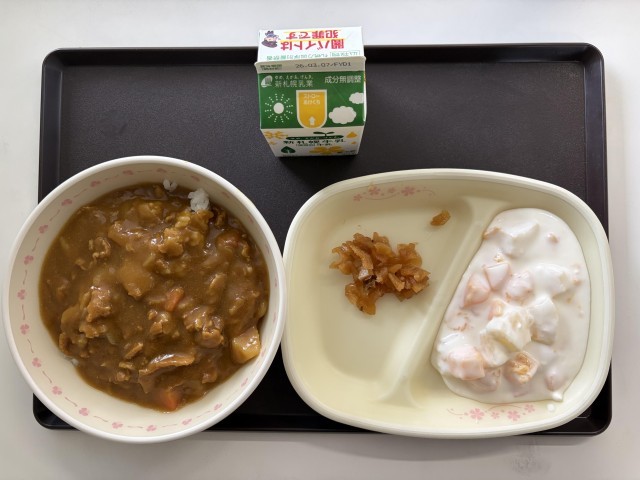 今日の献立は、ごはん、ポークカレー、フルーツヨーグルト、福神漬け、牛乳です。