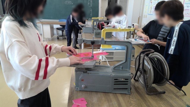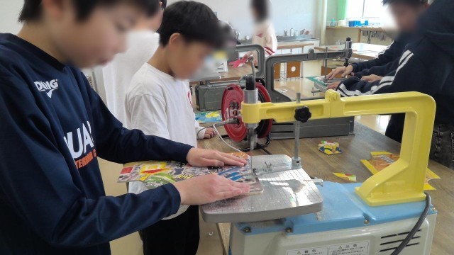 図工の学習では、電動糸のこを使ってパズル作りに挑戦中です。出来上がったパズルは、春に入学する新1年生に使ってもらいます。