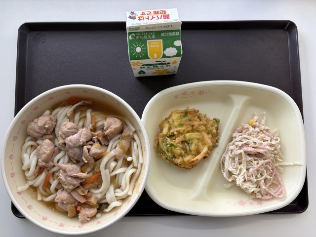 今日の献立は、五目うどん、かき揚げ、かみかみサラダ、牛乳です。