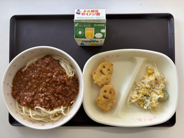 今日の献立は、スパゲッティミートソース、ミニオンフライドポテト(2ケ)、ごまドレサラダ、牛乳です。