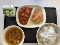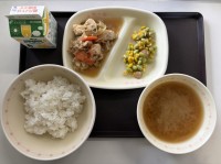 今日の献立は、ごはん、すまし汁、鶏肉のみそトマト煮、春雨サラダ、牛乳です。