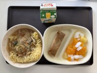 今日の献立は、広東ラーメン、春巻き、杏仁フルーツ、牛乳です。