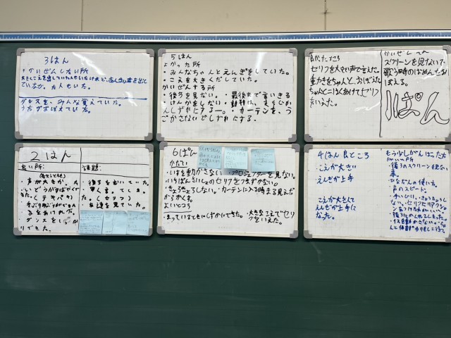 写真は4年生のホワイトボードです。班ごとに、自分たちの演目について振り返りをした時のものだそうです。