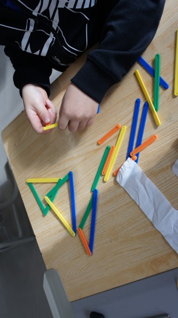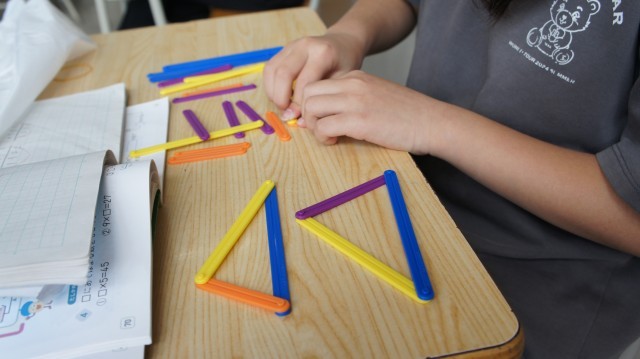 「三角形」「四角形」「辺」「頂点」など、これまでに習った算数用語を復習し、様々な三角形を作りました。(しっかり定着していたようで、子ども達からそのような用語が発表されていました)