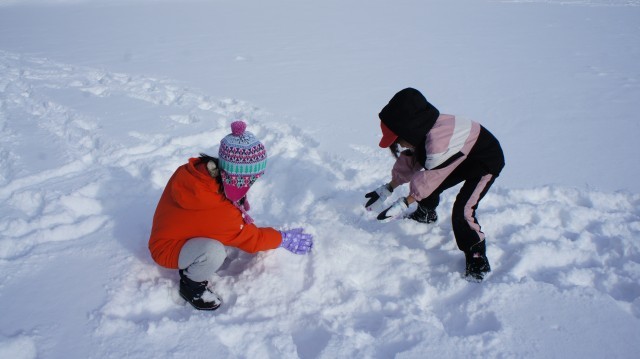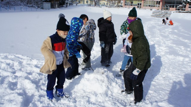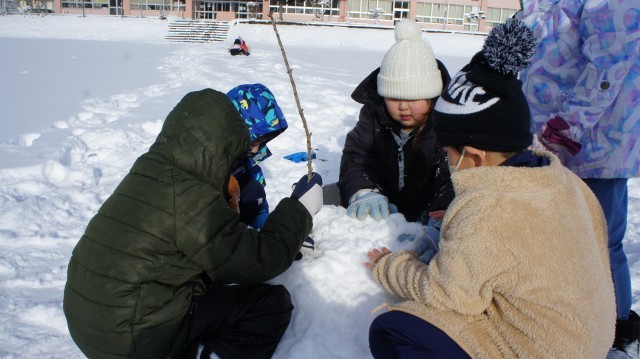 写真は、今日の20分休みの1年生です。雪だるまを…と思ったら、雪だるまがない!「壊して『かまくら』を作るの!」とのこと。今日の雪質でかまくらは…(苦笑)
