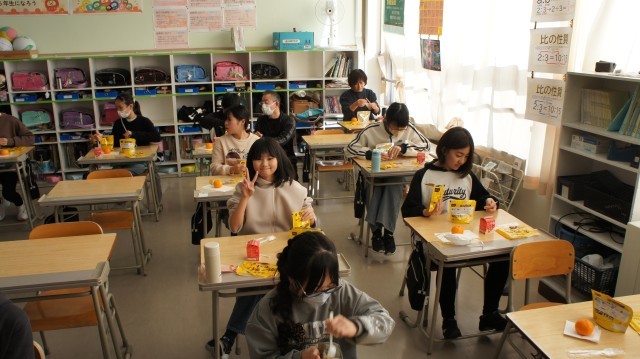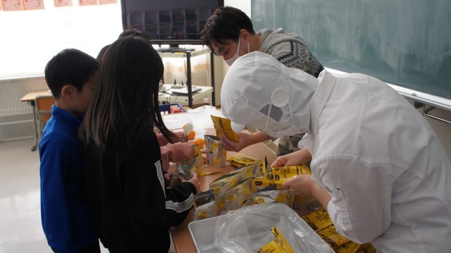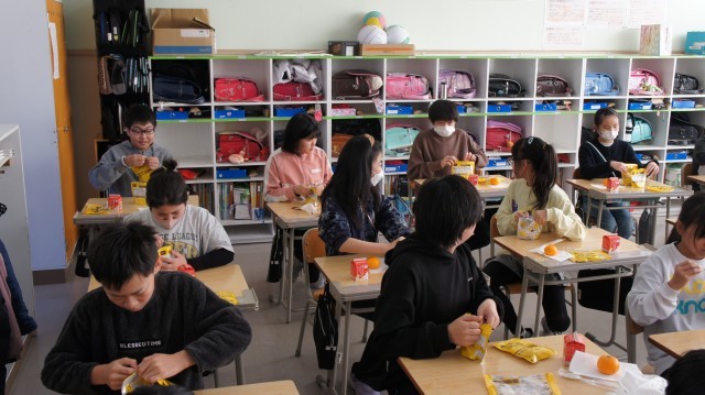 給食調理員さんの不足で、今日の給食は非常食のカレーとみかん、牛乳になりました。6年生に聞くと、「6年間、いつも給食だったから、初めての経験です!」と言っていました。