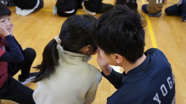 3枚目:伝言ゲームです。お題の文章が結構長くて、最初に伝える人が覚えるのも一苦労だったかもしれません。先頭と最後の人で伝言がずれて、大笑い。しっかり聞いて正しく伝えるって難しいですね(笑)