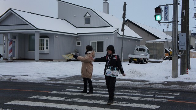 21日からの3日間、「平小コミュスク」のメンバーに声をかけ、横断歩道がない場所や交通量が多い場所に立っていただきました。