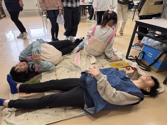 子ども達は「寝返りするのが大変」「階段を下りる時、下が見えなくて危ない」など、体験をしながら様々な気づきがあったようです。