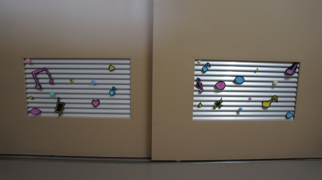 その模様を作成したのは5年生。図工の授業の中で取り組んだようです。場所や空間の特徴を生かし、面白く見えるようにつくりかえたようです。