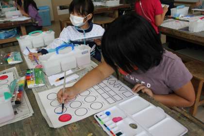 そしていよいよ着色です!いろいろな色を塗る体験ができるワークシートに赤⇒青⇒黄色⇒緑…と塗っていきました。はみ出さないように筆の穂先を外側に向けて、穂先を外枠の線に沿わせながらじっくり丁寧に塗っていきました。先生から「とても上手ですよ!」「みんなきれいに塗れています!」と、たくさん褒めてもらっていました。