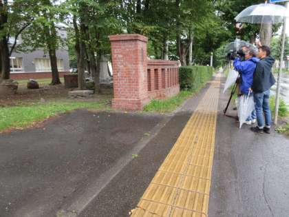STVどさんこワイドで「レンガ特集」をするにあたり、本校の校舎の取材に来ました。グラウンド側からの時計塔や8丁目側からの校門と校舎などを撮影していきました。その様子は9/20(金)16:00前後に放送される予定とのことです。
