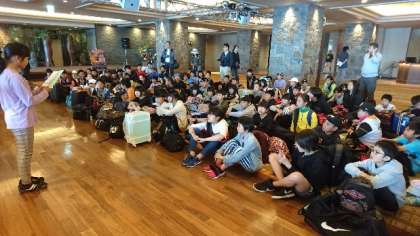 ホテルロビーで退館式を行い、お世話になったサンパレスの方々にお礼を言いました。ありがとうございました。