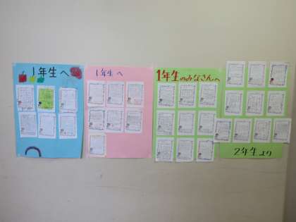 1年生教室への廊下の壁にメッセージが貼ってありました。見てみると、児童公開日の1年生の発表を見たほかの学年・学級からのメッセージでした。「大きな声がでていてよかった」「本番もがんばって!」など、素敵な言葉ばかりでした。すてきなお兄さんお姉さんで心が温かくなります。