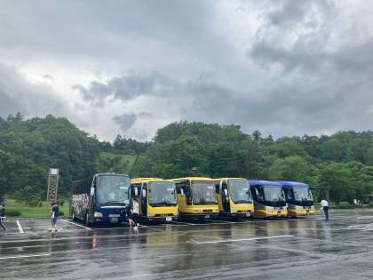 京極ふきだし公園は小雨です。芝生には座れなかったので、バス内でお弁当です。お弁当はどこで食べてもおいしいです。