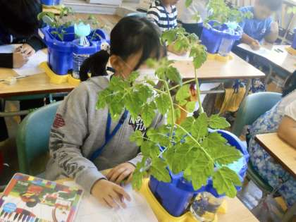 2年生は、ミニトマトを育てています。背丈もずいぶん伸びました。今日は肥料入りの土を入れて支柱を立ててあげました。
