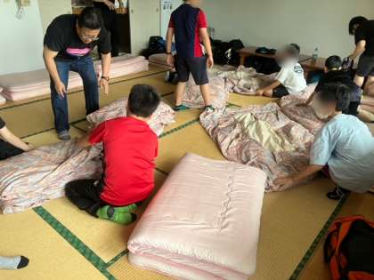 朝の集いではラジオ体操をしました。ふとんの整理整頓、合格できるかな?