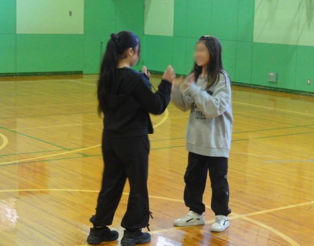 書記局が考えたレクをしました。今日は、ほめ言葉ドンじゃんけんです。両側から走ってきてぶつかったところでじゃんけんをして、勝った方は負けた方にほめ言葉を言い、相手のコーンのところまで行くと勝となります。新しいゲームで最初はとまどいもありましたが、よく考えたゲームだと思います。次も楽しみですね。
