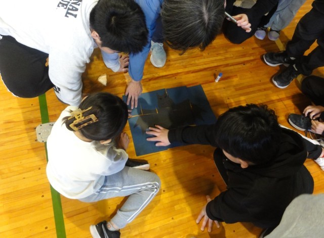 毎週水曜日は全校でレクをしています。今回は、体育館に隠されたカードを探して組み合わせると絵が完成するというレクです。思いがけない場所に隠されていたりということもありましたが、見事に全部発見しました。