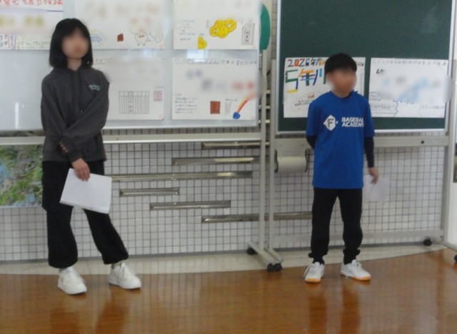 朝に児童玄関で、児童会役員選挙の選挙運動がありました。それぞれの候補者は、学校の課題や自分はどうしたいのかということをみんなに訴えていました。