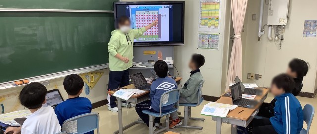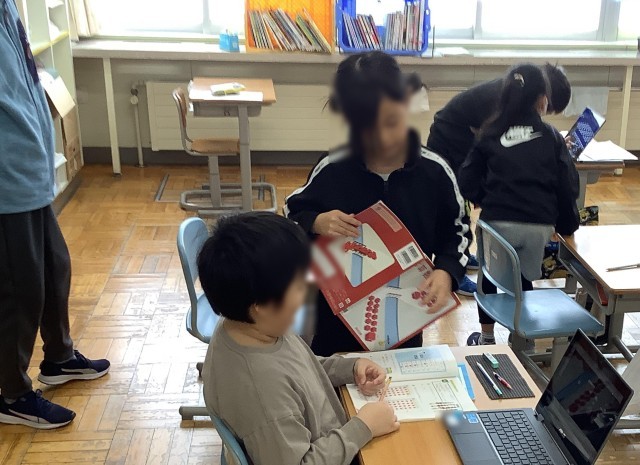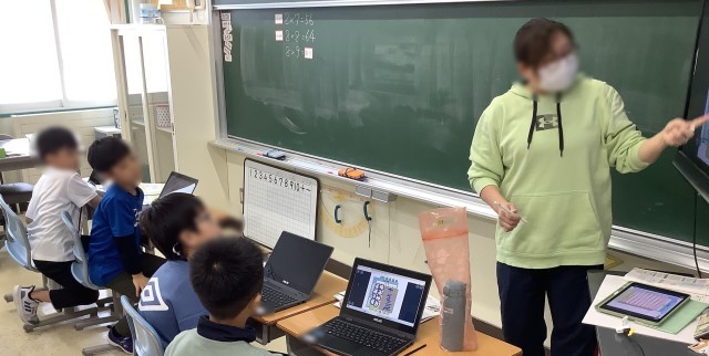 12/5(金)、2年生の算数「かけ算九九づくり」です!少人数に分けて学習しています。今日は8の段です。○の図に線を引いたり、囲んだりしながら、4のまとまりがいくつかを考えたり、5のまとまりと3のまとまりがいくつあるかを考えたりと、既に習っている九九とたし算を使って答えを出すことができました!自分たちで習ったことを使って、答えを求める力がついていますね!