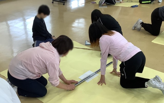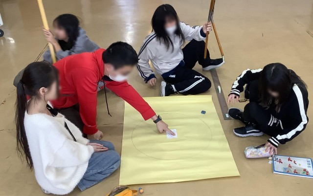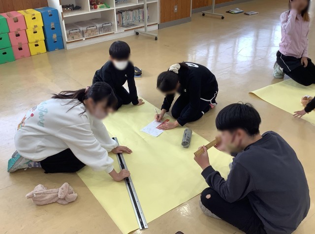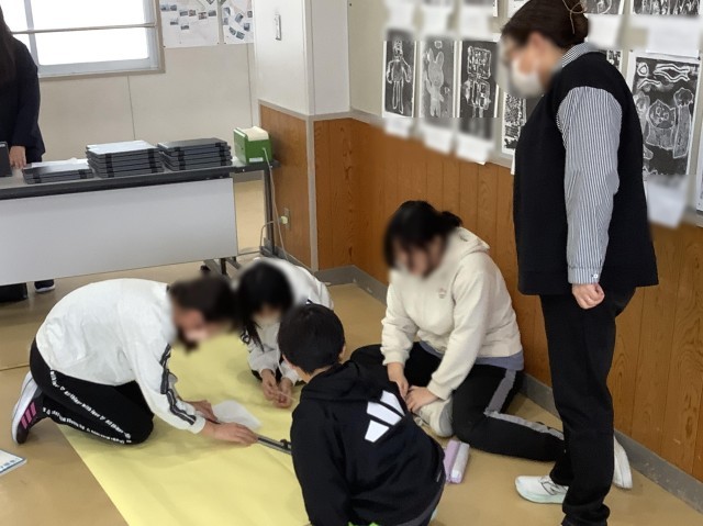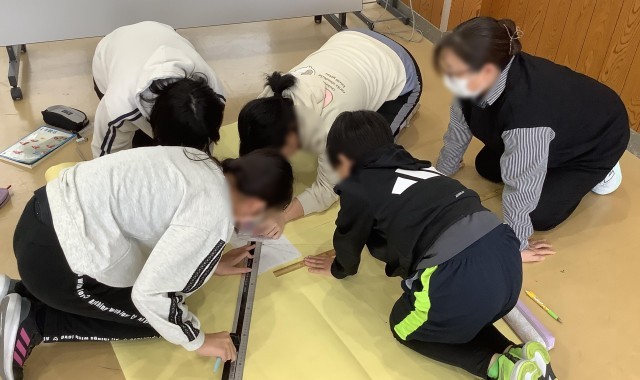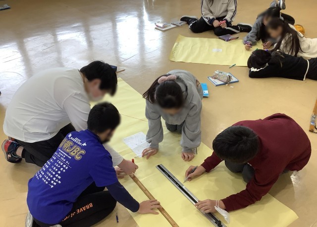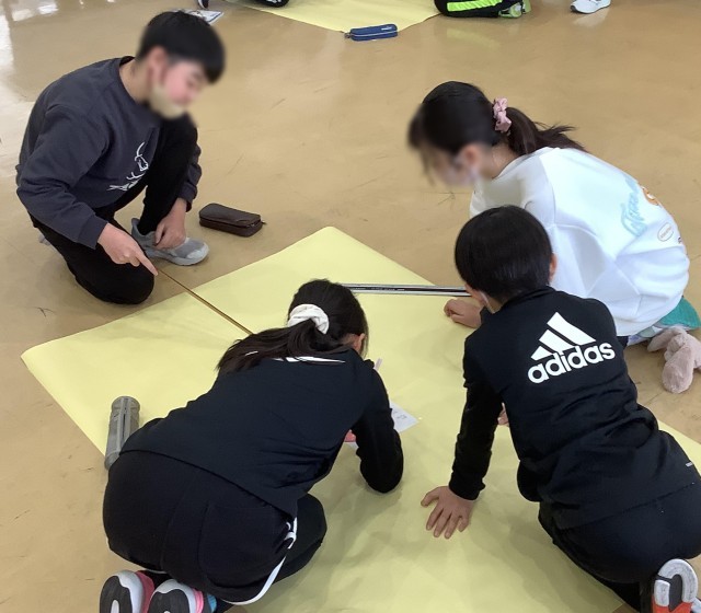 12/16(火)、6年生の算数「拡大図と縮図」です。今日は学習の発展として、大きな模造紙に拡大図をかきました!図案は各グループが考えて、魔方陣やダイアモンド、手裏剣や人の形などいろいろでした。ノートに書いた図を使って5~6倍の拡大図をみんなで協力しながらかいていました!