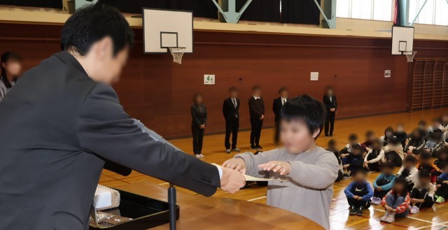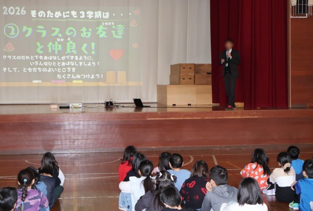 1/16(金)、第3学期の始業式を行いました。会の前には、転入生1名の紹介と海の子作品展での入賞者2名の表彰式を行いました。式では、2・4・6年生が「冬休みの思い出と3学期頑張ること」を発表しました。家族と楽しく過ごしたり、スキーを頑張ったりしたことを、立派に発表してくれました。児童会役員からも、3学期に向けての話がありました。「校長先生のお話」では、4月からの新学年を見据えて3学期に頑張ってほしいこととして、①今年のお勉強は今年のうちに!②クラスのお友達と仲良く!と話しました。3学期は45日間(6年生は43日間)と短いですが、より充実した学期となるよう、教職員一同取り組んでまいりますので、これまで同様、どうぞよろしくお願いいたします。