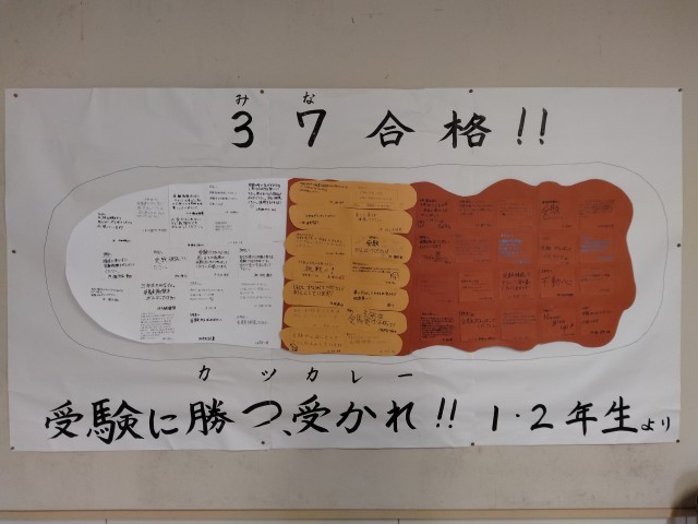 1,2年生から3年生への激励メッセージ。全体像は「カツカレー」となっています。たくさんの勇気をもらった3年生のみなさん、万全の状態で臨みましょう。頑張れ!!