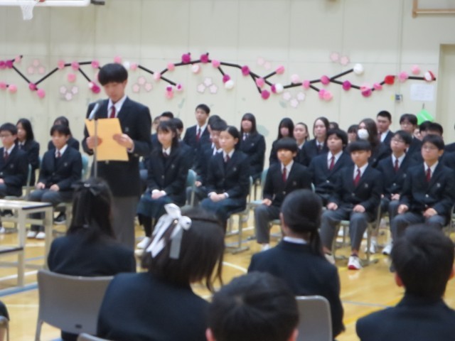 本日は入学式でした。35名の新入生、返事も態度も大変立派でした。そして、在校生代表からの歓迎の言葉、新入生代表の誓いの言葉、どちらも素晴らしいものでした。これで平中生89名がそろいました。どんな活躍を見せてくれるのか、とても楽しみです。