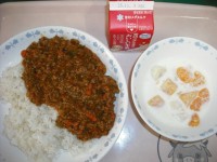 麦ご飯、玉ねぎとしめじのみそ汁、みそ煮こみおでん、もやしのピリ辛あえ、牛乳