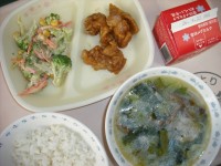 ・わかめご飯・キャベツとさつま揚げのみそ汁・釧路産たらザンギ・きんぴらごぼう・牛...