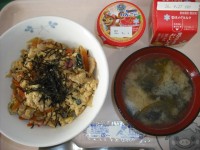 ・三色丼・じゃがいもと大根のみそ汁・フルーツゼリー・牛乳843kcal