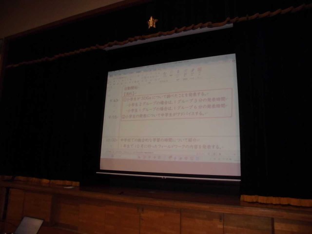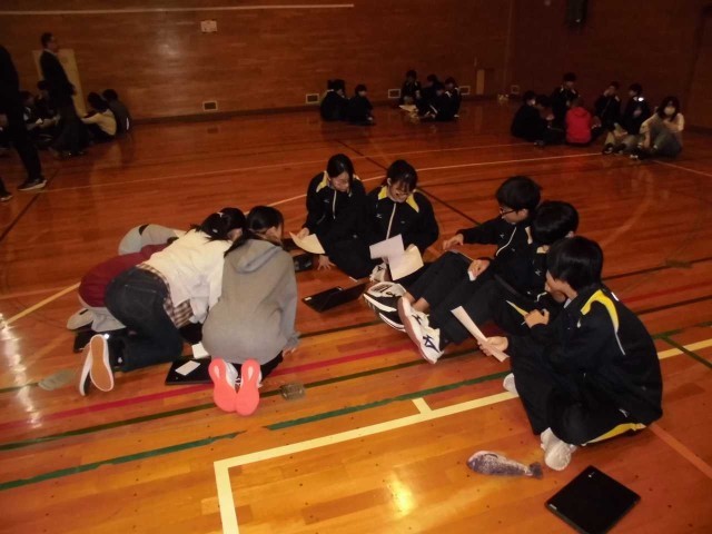 2年生がスキー学習の日、1年生と小学6年生が総合の発表を中学校の体育館で行いました。