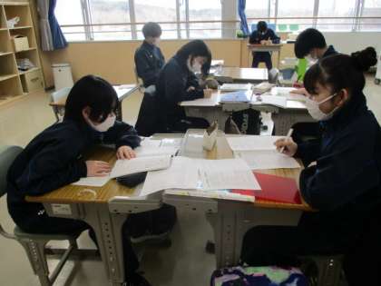 来週の火・水の公立高校入試日、1・2年生は学年末テストです。前回まで放課後に学習会を実施しましたが、時数に見通しがあり、1・2年生は5時間授業で学習会、3年生は通常授業としました。