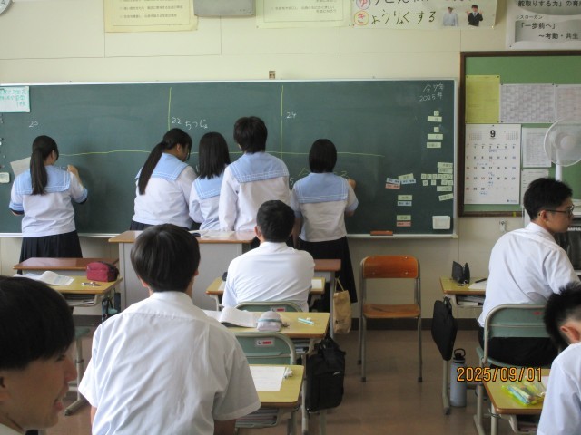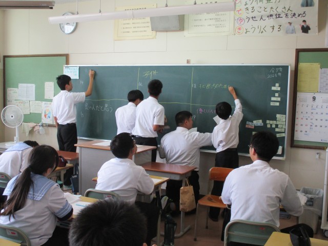 「二通の手紙」という読み物を通して、法やきまりの意義について意見交換。規律ある社会に実現に向けて考え議論しました。