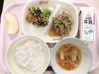 本日の献立 牛乳、ごはん、豚肉とごぼうの甘辛炒め、納豆和え、沢煮椀、りんご です...