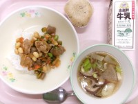 本日の献立 牛乳・ごはん・県産大豆のピリ辛丼、ひっつみ汁、手づくりがんづき です...