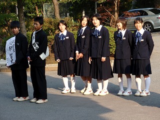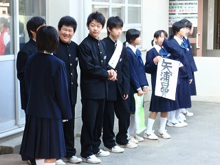 選挙取り組みも4日目に入り、立候補者の他に学級の応援団がたくさん参加し活発な朝の選挙活動が展開されています。7:15から朝のトレーニングに参加し、すぐに着替えて7:50からの選挙応援する姿が見られます。