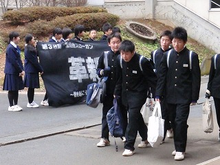 12月5日(金)生徒会執行部が自分たちのスローガン(『革新』〜巻き起そう僕らの風〜)を旗に託して作成していましたが、ようやく完成しました。生徒昇降口でお披露目をしました。1年間この目標に向かって取り組みます。体育館に飾り、みんなに見えるようにして取り組んでいきます。